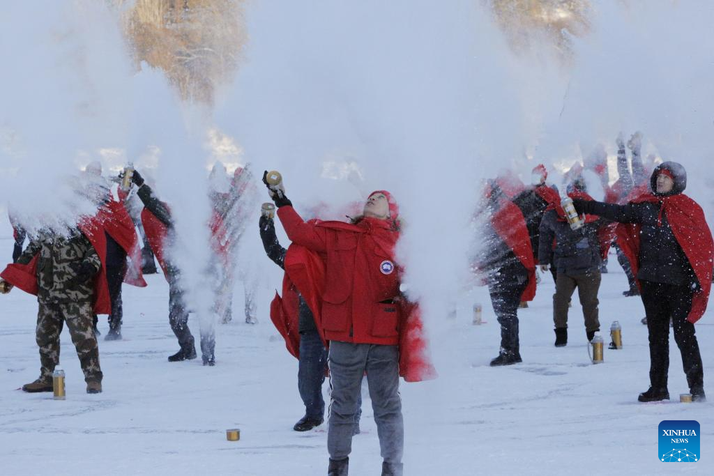 Visitors play a "water to ice" game by splashing water into the cold air in Beiji Village of Mohe, northeast China's Heilongjiang Province, Dec. 22, 2023. Known as China's "North Pole," Mohe has developed a variety of winter tourism programs in recent years, attracting tourists to experience an "extremely cold journey." (Xinhua/Shi Feng)