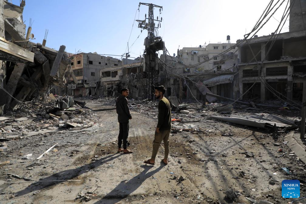 People inspect the damage after an Israeli strike in the southern Gaza Strip city of Khan Younis, on Dec. 24, 2023. At least 166 Palestinians were killed and 384 others were wounded during the past 24 hours by the ongoing Israeli attacks on the Gaza Strip, said the Gaza-based Health Ministry on Sunday. (Photo by Rizek Abdeljawad/Xinhua)