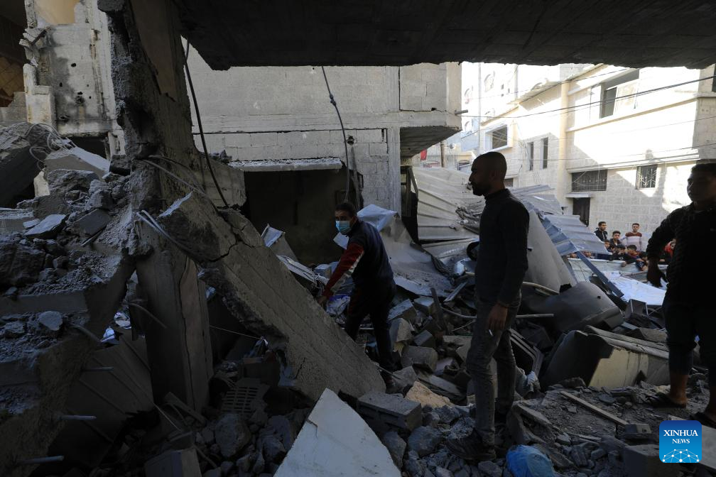 People inspect the rubble after an Israeli airstrike in the southern Gaza Strip city of Rafah, Dec. 24, 2023. At least 166 Palestinians were killed and 384 others were wounded during the past 24 hours by the ongoing Israeli attacks on the Gaza Strip, said the Gaza-based Health Ministry on Sunday. (Photo by Yasser Qudih/Xinhua)