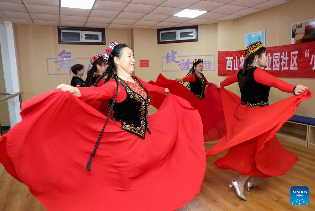Residents dance at a community center of the Xinjiang Production and Construction Corps in northwest China's Xinjiang Uygur Autonomous Region, Dec. 20, 2023. Practical and specific measures are being taken to ensure local people's well-being in the ongoing national program that rallies all-round support for Xinjiang, and the Xinjiang Production and Construction Corps is one of the many examples. (Xinhua/Hu Huhu)