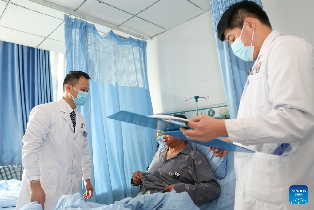Liu Tianyou, a doctor from east China's Jiangsu Province, performs an examination for a patient at a hospital of the Xinjiang Production and Construction Corps in northwest China's Xinjiang Uygur Autonomous Region, Dec. 23, 2023. Practical and specific measures are being taken to ensure local people's well-being in the ongoing national program that rallies all-round support for Xinjiang, and the Xinjiang Production and Construction Corps is one of the many examples. (Xinhua/Hu Huhu)