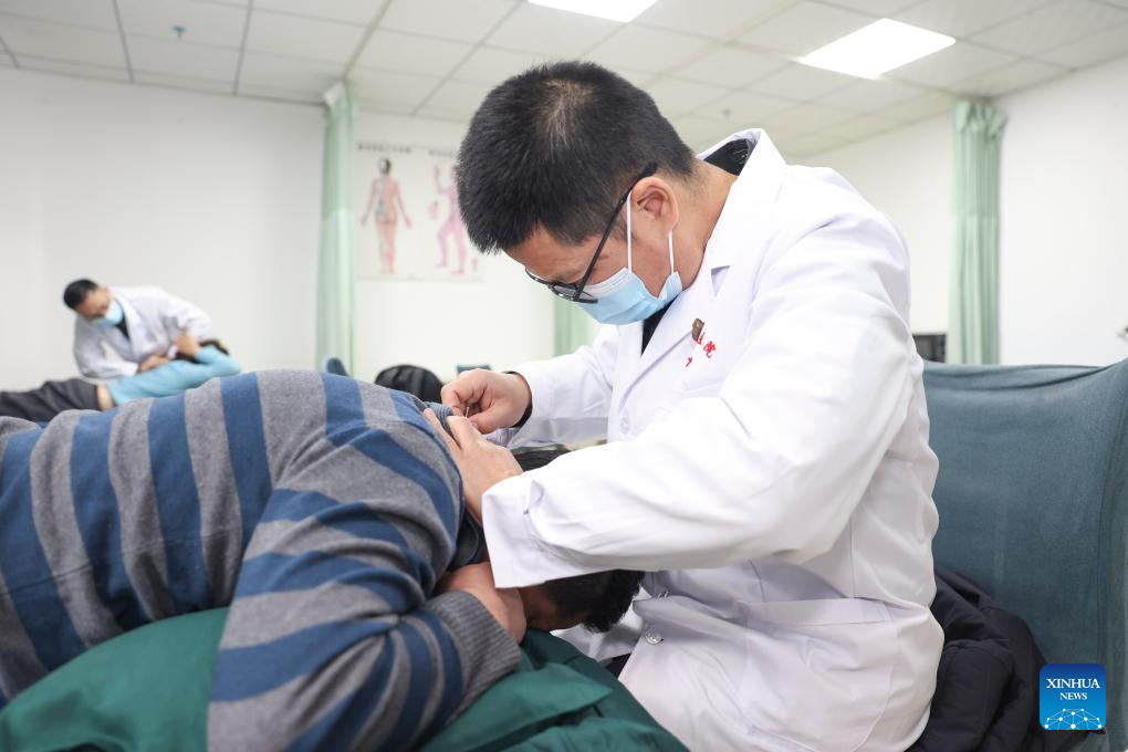 Doctor Zhang Guodong gives a therapy to a patient at a hospital of the Xinjiang Production and Construction Corps in northwest China's Xinjiang Uygur Autonomous Region, Dec. 19, 2023. Practical and specific measures are being taken to ensure local people's well-being in the ongoing national program that rallies all-round support for Xinjiang, and the Xinjiang Production and Construction Corps is one of the many examples. (Xinhua/Hu Huhu)