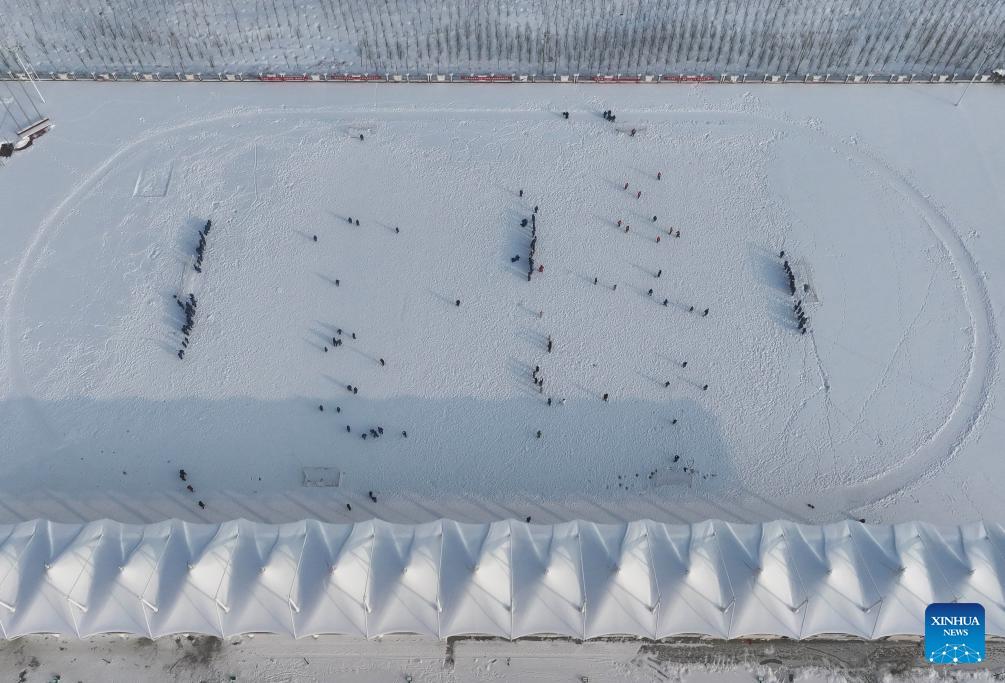 This aerial photo taken on Dec. 23, 2023 shows students playing a snowfield football game at a middle school of the Xinjiang Production and Construction Corps in northwest China's Xinjiang Uygur Autonomous Region. Practical and specific measures are being taken to ensure local people's well-being in the ongoing national program that rallies all-round support for Xinjiang, and the Xinjiang Production and Construction Corps is one of the many examples. (Xinhua/Hu Huhu)