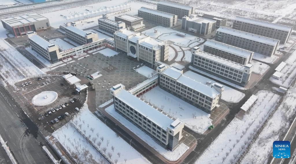 This photo taken on Dec. 23, 2023 shows a middle school built with support from Jiangsu Province at the Xinjiang Production and Construction Corps in northwest China's Xinjiang Uygur Autonomous Region. Practical and specific measures are being taken to ensure local people's well-being in the ongoing national program that rallies all-round support for Xinjiang, and the Xinjiang Production and Construction Corps is one of the many examples. (Xinhua/Hu Huhu)