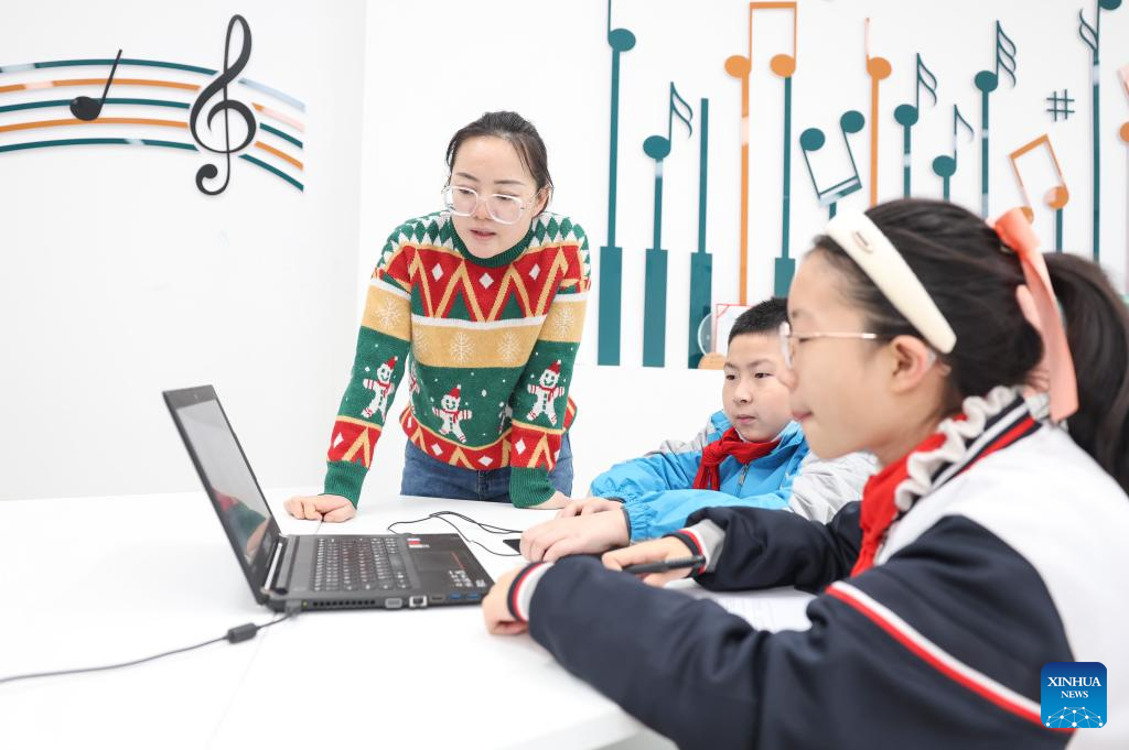 Teacher Jin Feng tutors students at a school of the Xinjiang Production and Construction Corps in northwest China's Xinjiang Uygur Autonomous Region, Dec. 19, 2023. Practical and specific measures are being taken to ensure local people's well-being in the ongoing national program that rallies all-round support for Xinjiang, and the Xinjiang Production and Construction Corps is one of the many examples. (Xinhua/Hu Huhu)