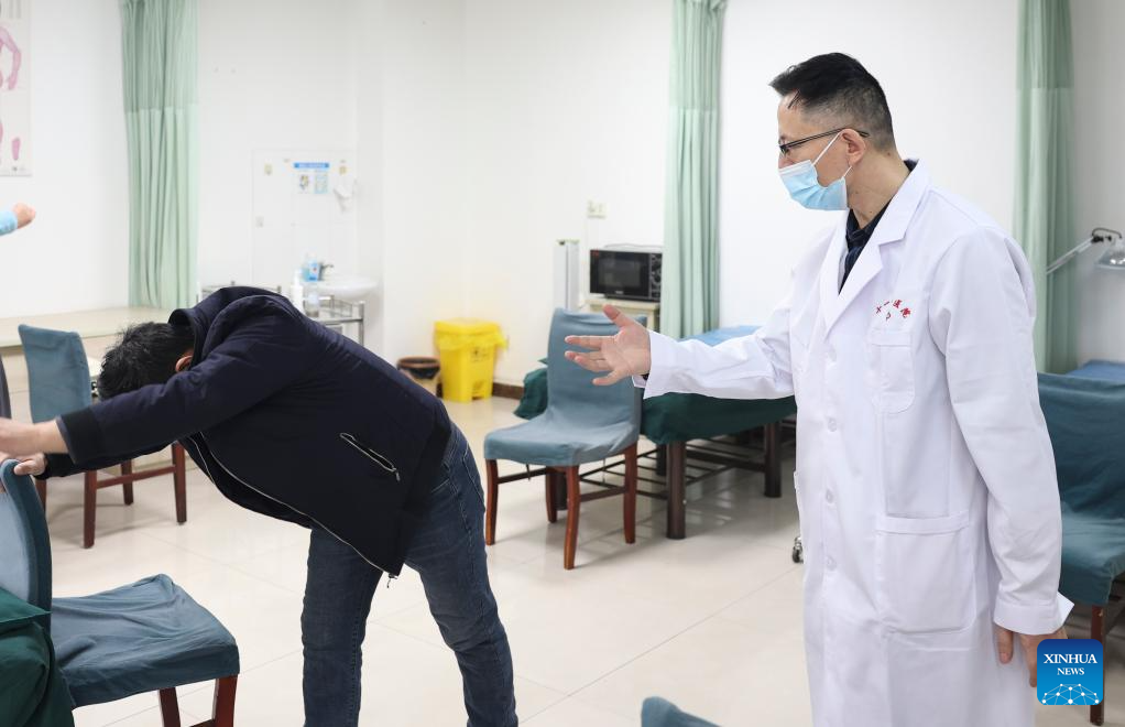 Doctor Lyu Xinfeng instructs a patient in rehabilitation exercise at a hospital of the Xinjiang Production and Construction Corps in northwest China's Xinjiang Uygur Autonomous Region, Dec. 19, 2023. Practical and specific measures are being taken to ensure local people's well-being in the ongoing national program that rallies all-round support for Xinjiang, and the Xinjiang Production and Construction Corps is one of the many examples. (Xinhua/Hu Huhu)
