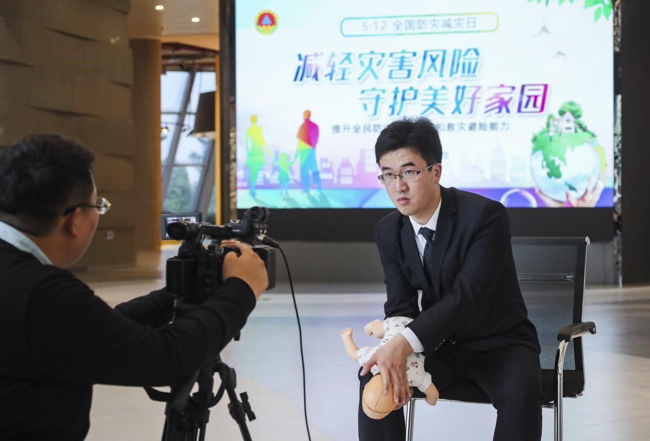 An employee of the civil defense museum in Huai'an, east China's Jiangsu province, teaches Heimlich maneuver, or abdominal thrusts, through livestreaming. (People's Daily Online/Zhao Qirui)