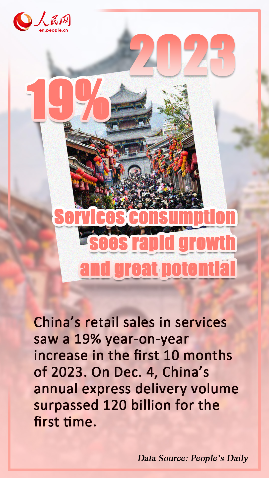 China’s retail sales in services saw a 19-percent year-on-year increase in the first 10 months of 2023. This growth, spurred by factors such as festivals, has led to a further release of demand in sectors like accommodation and catering, culture and tourism, and transportation. Additionally, on Dec. 4, China’s annual express delivery volume surpassed 120 billion for the first time.