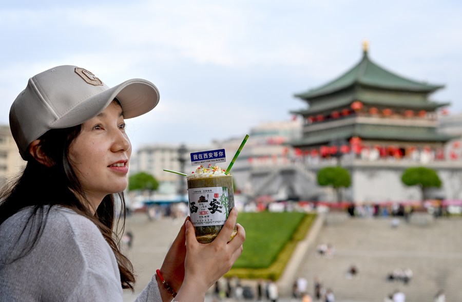 A tourist, with a new-style tea drink in her hands, enjoys the view near the Bell Tower in Xi'an, northwest China's Shaanxi Province, May 2, 2023. (Xinhua/Zou Jingyi)