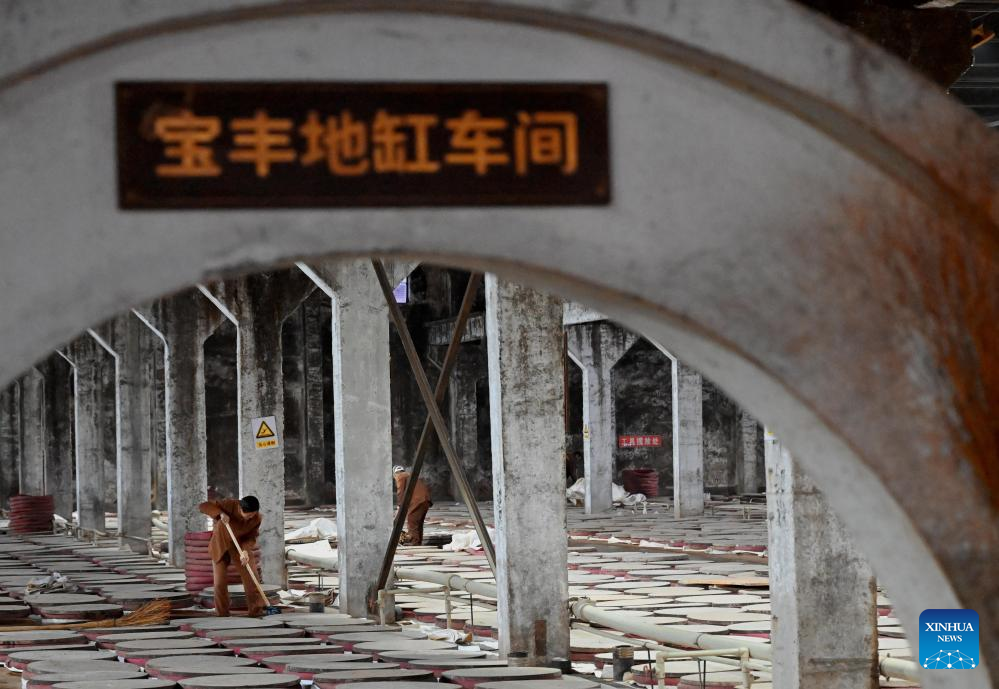 A worker is busy at a workshop of Baofeng Baijiu Co., LTD in Baofeng County, central China's Henan Province, Dec. 21, 2023. (Xinhua/Li An)