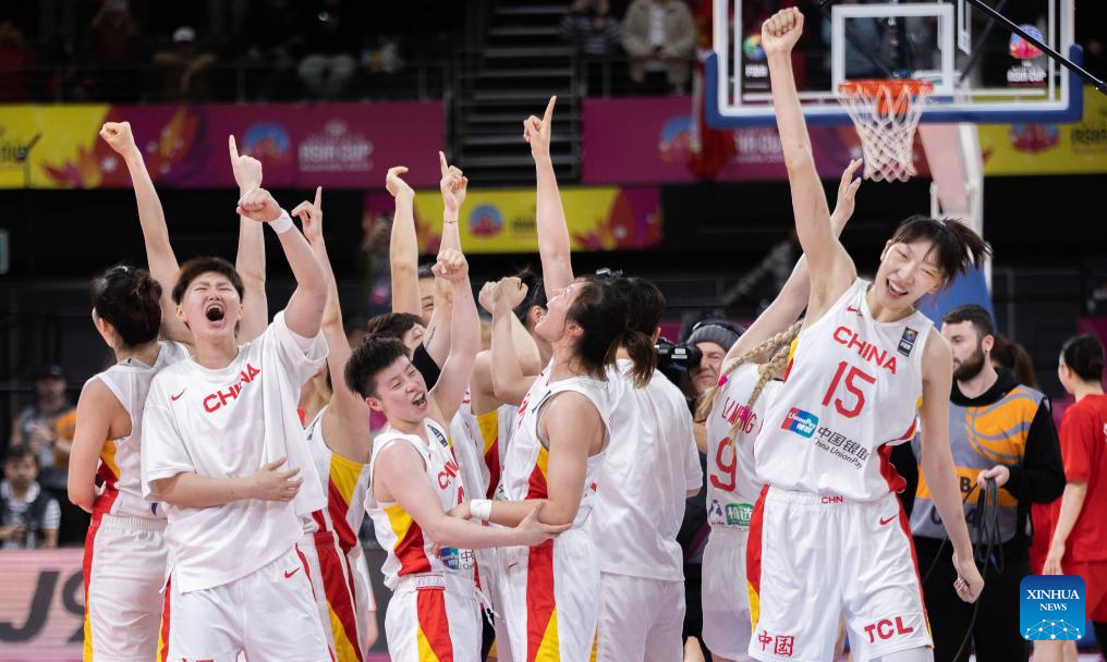 This file photo taken on July 2, 2023 shows players of China celebrating after winning the final match against Japan at the 2023 FIBA Women's Asia Cup in Sydney, Australia. (Photo by Hu Jingchen/Xinhua)