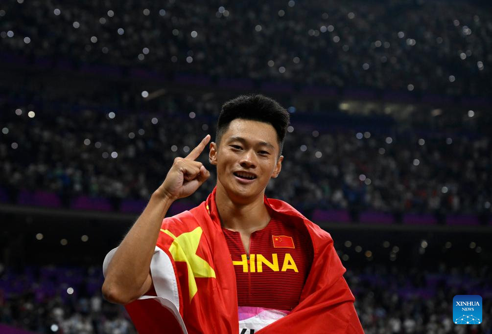 This file photo taken on Sept. 30, 2023 shows Xie Zhenye of China celebrating after winning the Men's 100m Final of Athletics at the 19th Asian Games in Hangzhou, east China's Zhejiang Province. (Xinhua/Song Yanhua)