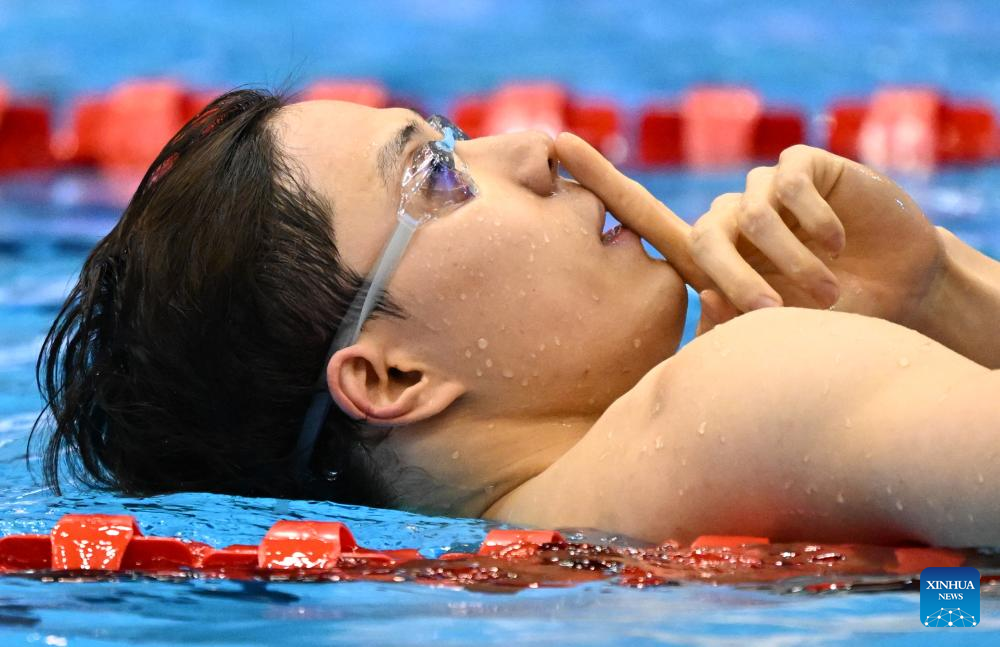 This file photo taken on July 24, 2023 shows Qin Haiyang of China celebrating after winning the men's 100m breaststroke final at the World Aquatics Championships in Fukuoka, Japan. (Xinhua/Xia Yifang)