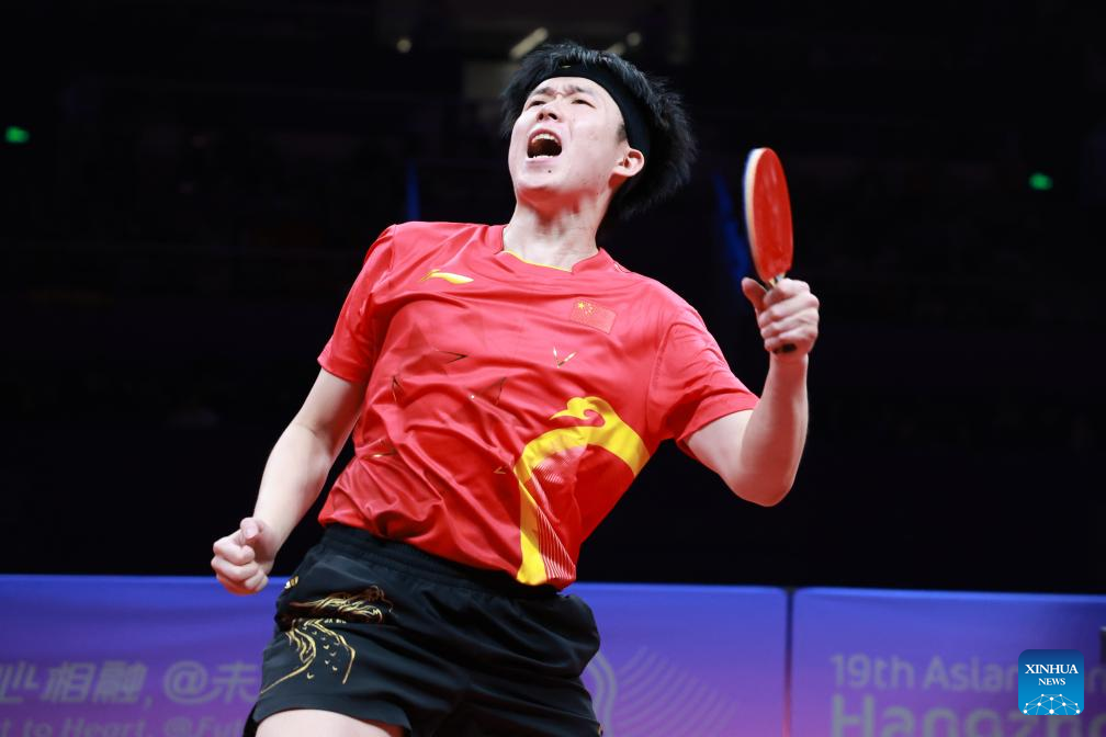 This file photo taken on Sept. 26, 2023 shows Wang Chuqin of China celebrating during the men's team finals table tennis match between China and South Korea at the 19th Asian Games in Hangzhou, east China's Zhejiang Province. (Xinhua/Liu Xu)