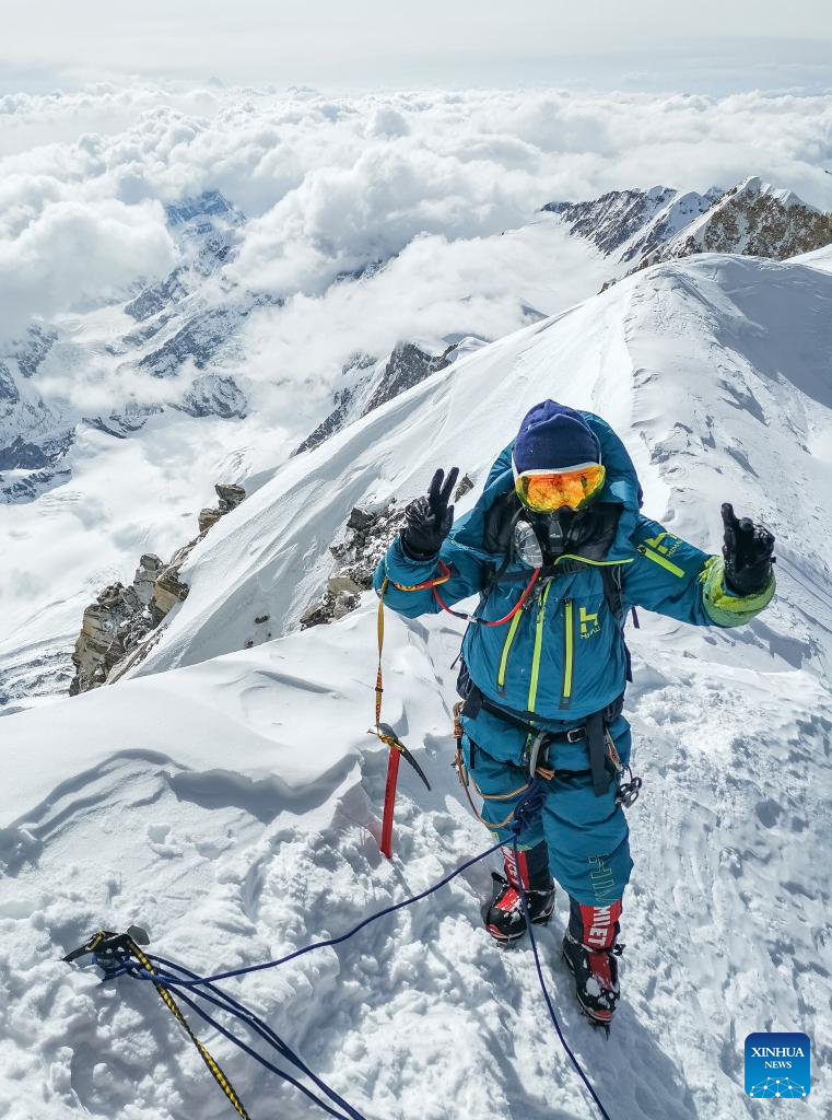 This file photo taken on April 26, 2023 shows Dong Hongjuan of China gesturing atop the Mount Shishapangma, in Nyalam County of Xigaze, southwest China's Xizang Autonomous Region. (Photo by Dompa/Xinhua)