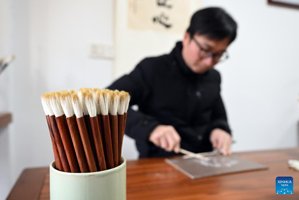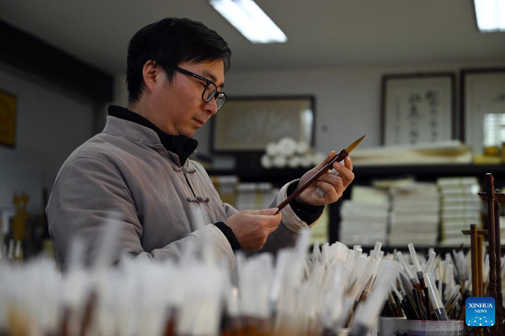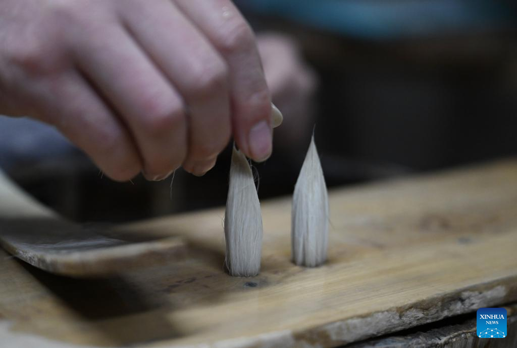 She Ji makes a Xuan brush in Jingxian County, east China's Anhui Province, Dec. 20, 2023. (Xinhua/Zhou Mu)