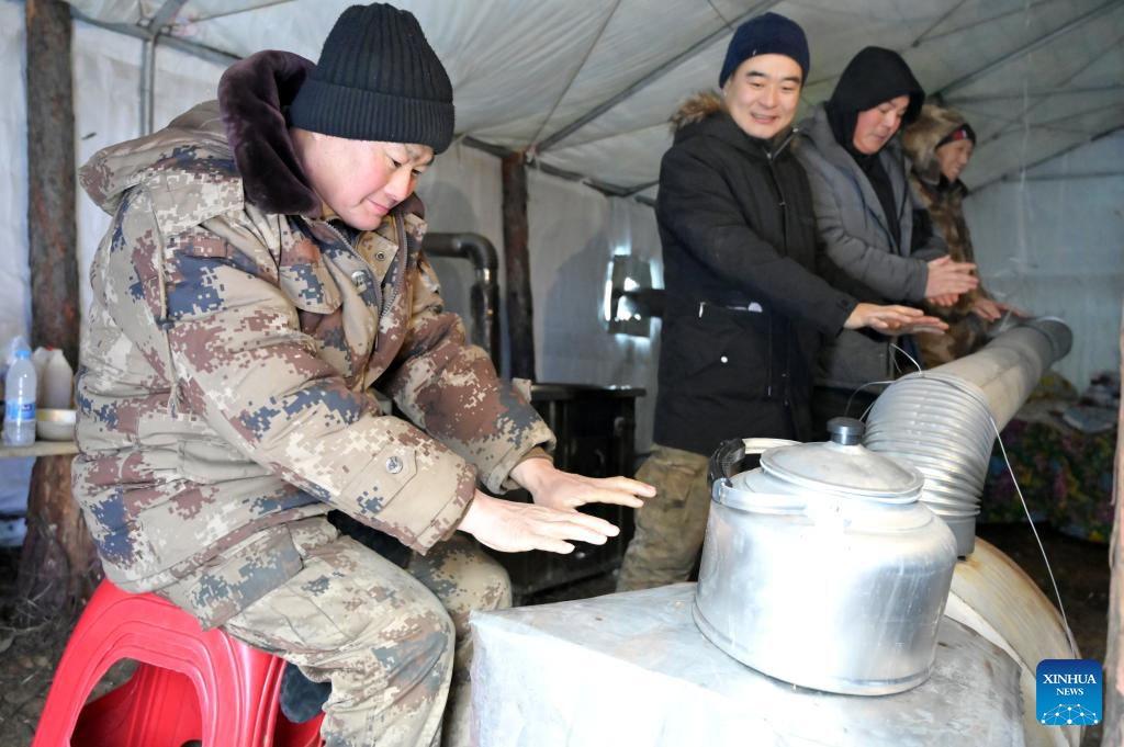Staff members warm themselves during a break at a work place of Mohe forestry station in Beiji Town of Mohe, northeast China's Heilongjiang Province, Dec. 24, 2023. In Mohe, the northernmost city of China, workers from all walks of life are faced with extremely cold climate in winter. People of different professions stick to their posts here despite harsh winter weather to protect the environment and safeguard life of local residents and tourists. (Xinhua/Shi Feng)
