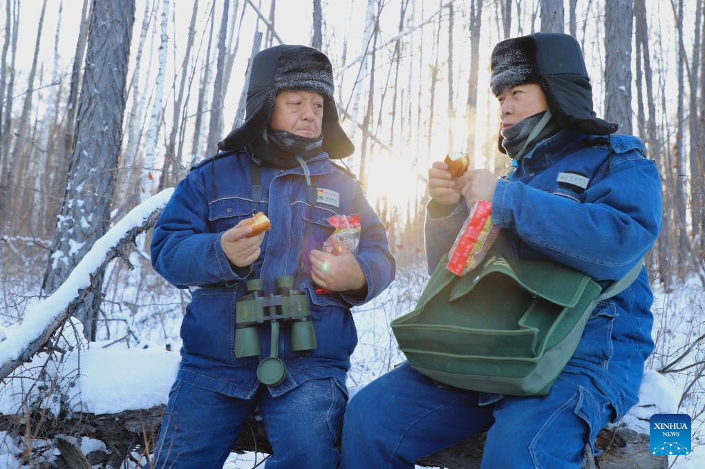 Director Lyu Jiansheng (L) and his colleague Wang Shaoting, staff members of a local power supply station, eat food during their power line patrol in Mohe, northeast China's Heilongjiang Province, Dec. 23, 2023. In Mohe, the northernmost city of China, workers from all walks of life are faced with extremely cold climate in winter. People of different professions stick to their posts here despite harsh winter weather to protect the environment and safeguard life of local residents and tourists. (Xinhua/Xu Kaixin)