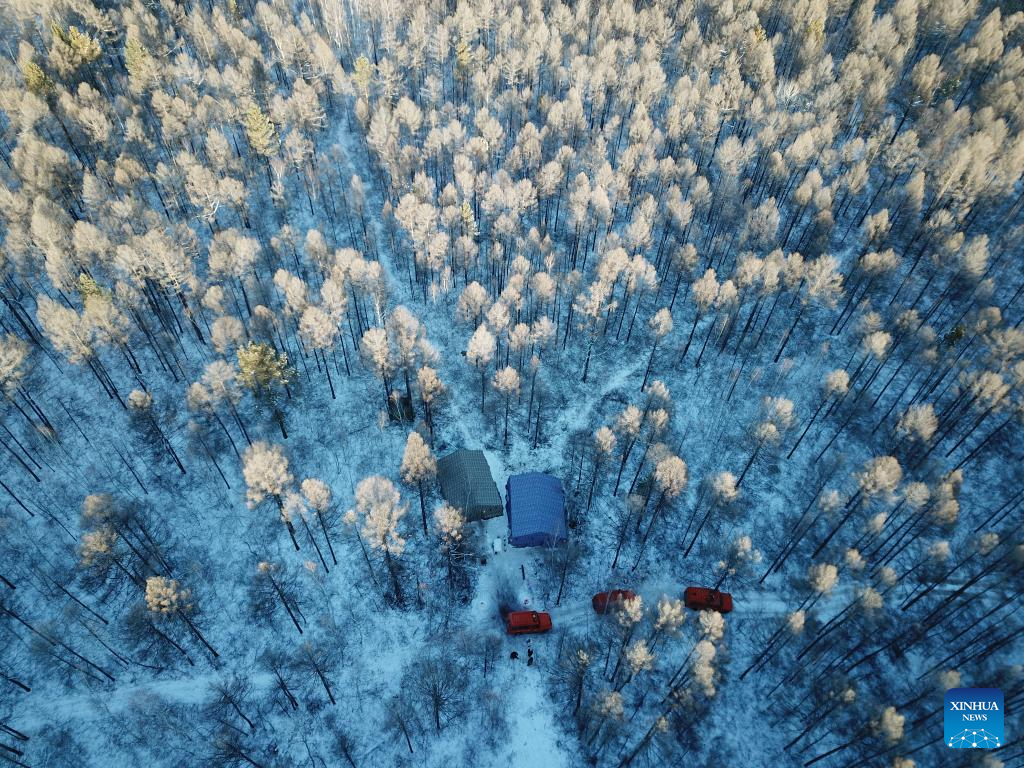 This aerial photo taken on Dec. 24, 2023 shows a work place of Mohe forestry station in Beiji Town of Mohe, northeast China's Heilongjiang Province. In Mohe, the northernmost city of China, workers from all walks of life are faced with extremely cold climate in winter. People of different professions stick to their posts here despite harsh winter weather to protect the environment and safeguard life of local residents and tourists. (Xinhua/Shi Feng)