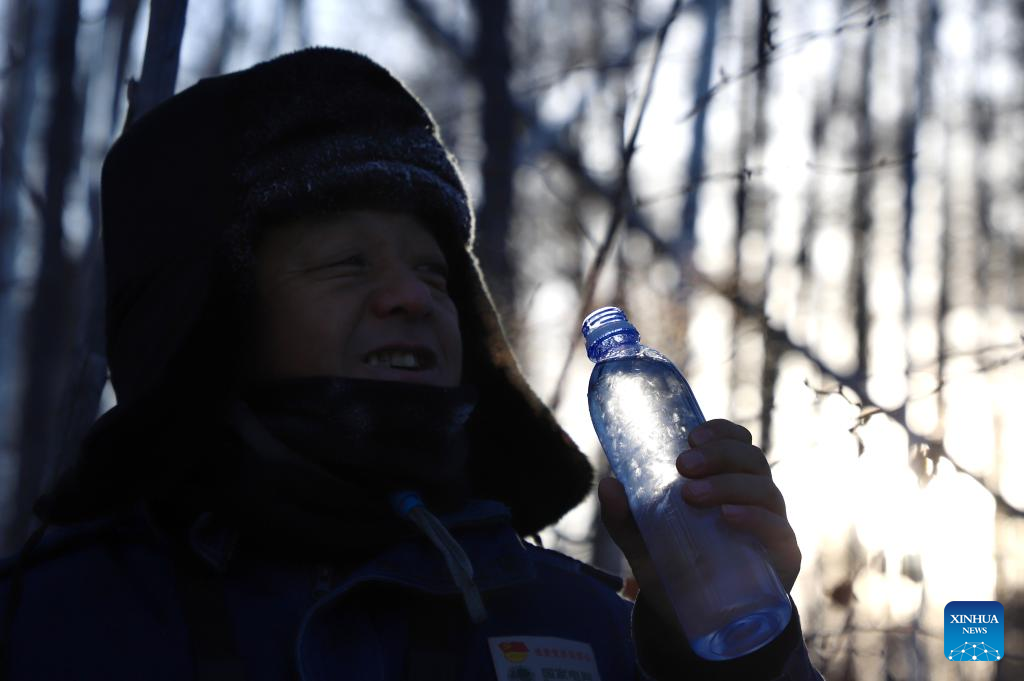 Lyu Jiansheng, director of a local power supply station, drinks icy water during his power line patrol in Mohe, northeast China's Heilongjiang Province, Dec. 23, 2023. In Mohe, the northernmost city of China, workers from all walks of life are faced with extremely cold climate in winter. People of different professions stick to their posts here despite harsh winter weather to protect the environment and safeguard life of local residents and tourists. (Xinhua/Xu Kaixin)