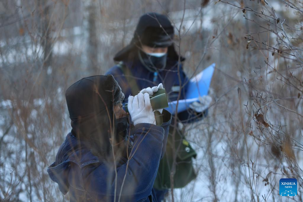 Director Lyu Jiansheng (L) and his colleague Wang Shaoting, staff members of a local power supply station, conduct power line patrol in Mohe, northeast China's Heilongjiang Province, Dec. 23, 2023. In Mohe, the northernmost city of China, workers from all walks of life are faced with extremely cold climate in winter. People of different professions stick to their posts here despite harsh winter weather to protect the environment and safeguard life of local residents and tourists. (Xinhua/Jin Di)