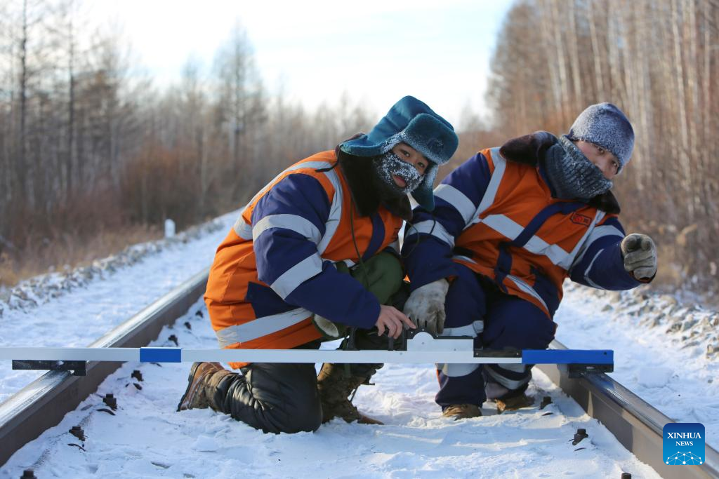 Railway workers measure rail tracks in Mohe, northeast China's Heilongjiang Province, Dec. 20, 2023. In Mohe, the northernmost city of China, workers from all walks of life are faced with extremely cold climate in winter. People of different professions stick to their posts here despite harsh winter weather to protect the environment and safeguard life of local residents and tourists. (Xinhua/Shi Feng)