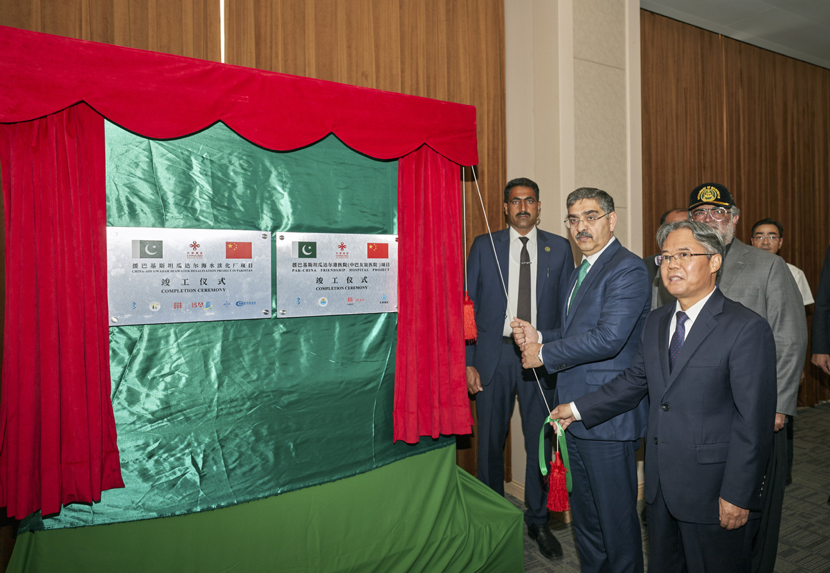 Pakistani Prime Minister Anwar-ul-Haq Kakar (second from right) and Chinese Ambassador to Pakistan Jiang Zaidong (first from right) attend the inauguration ceremony of the China-aided desalination project and upgrading of the Pak-China Friendship Hospital in Gwadar, Pakistan, on Dec 4. [Photo/Xinhua]