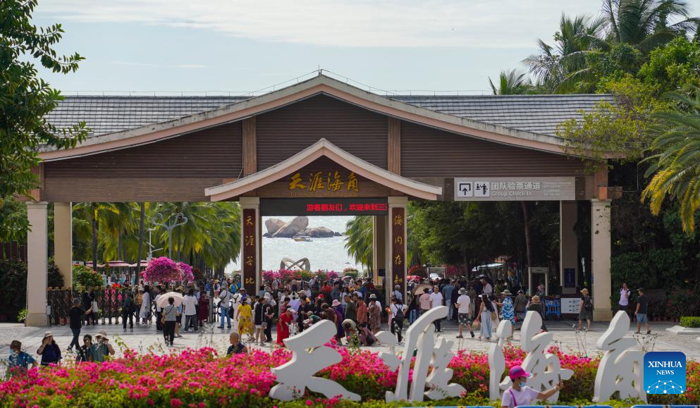 Tourists are seen at the entrance of Tianyahaijiao, a popular attraction which literally means the "edges of heaven and corners of the sea," in Sanya, south China's Hainan Province, Dec. 19, 2023. Since the beginning of winter, the tourism market in Sanya has been heating up continuously. According to official data, the city witnessed a peak season for tourism since mid-November, which is expected to last until the Spring Festival. (Xinhua/Fan Yuqing)