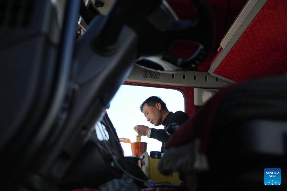 Ma Ming prepares to have a quick lunch while waiting for unloading at a prefab house transfer point in Liugou Township of Jishishan, northwest China's Gansu Province, Dec. 26, 2023. (Xinhua/Fang Xin)