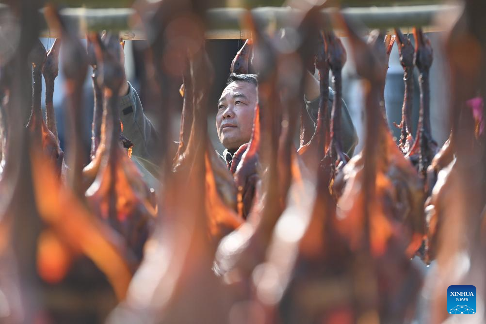 A villager dries cured ducks in Ma'an Village of Luzhai County, south China's Guangxi Zhuang Autonomous Region, Dec. 26, 2023. The alluring aroma of cured meat has wafted out as winter comes. (Xinhua/Huang Xiaobang)
