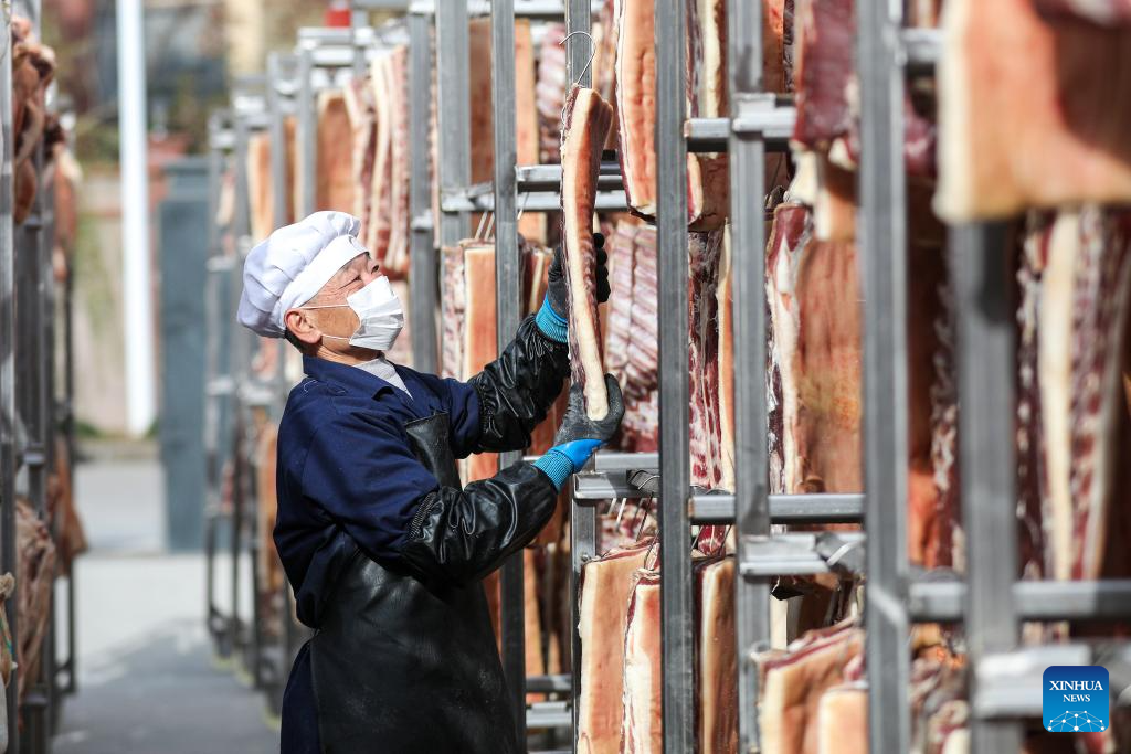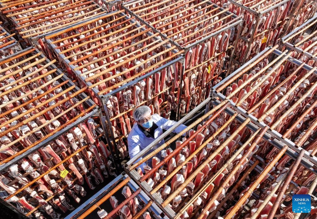 A worker dries cured meat at a food processing company in Huangshan, east China's Anhui Province, Dec. 26, 2023. The alluring aroma of cured meat has wafted out as winter comes. (Photo by Fan Chengzhu/Xinhua)