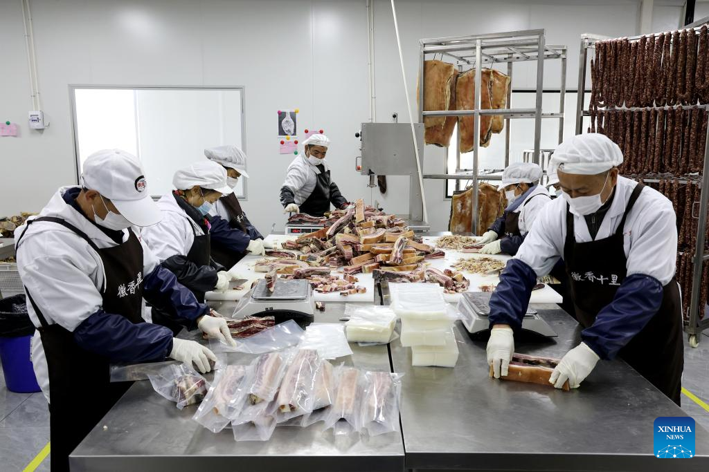 Workers pack cured meat products at the workshop of a food processing company in Huangshan, east China's Anhui Province, Dec. 26, 2023. The alluring aroma of cured meat has wafted out as winter comes. (Photo by Fan Chengzhu/Xinhua)