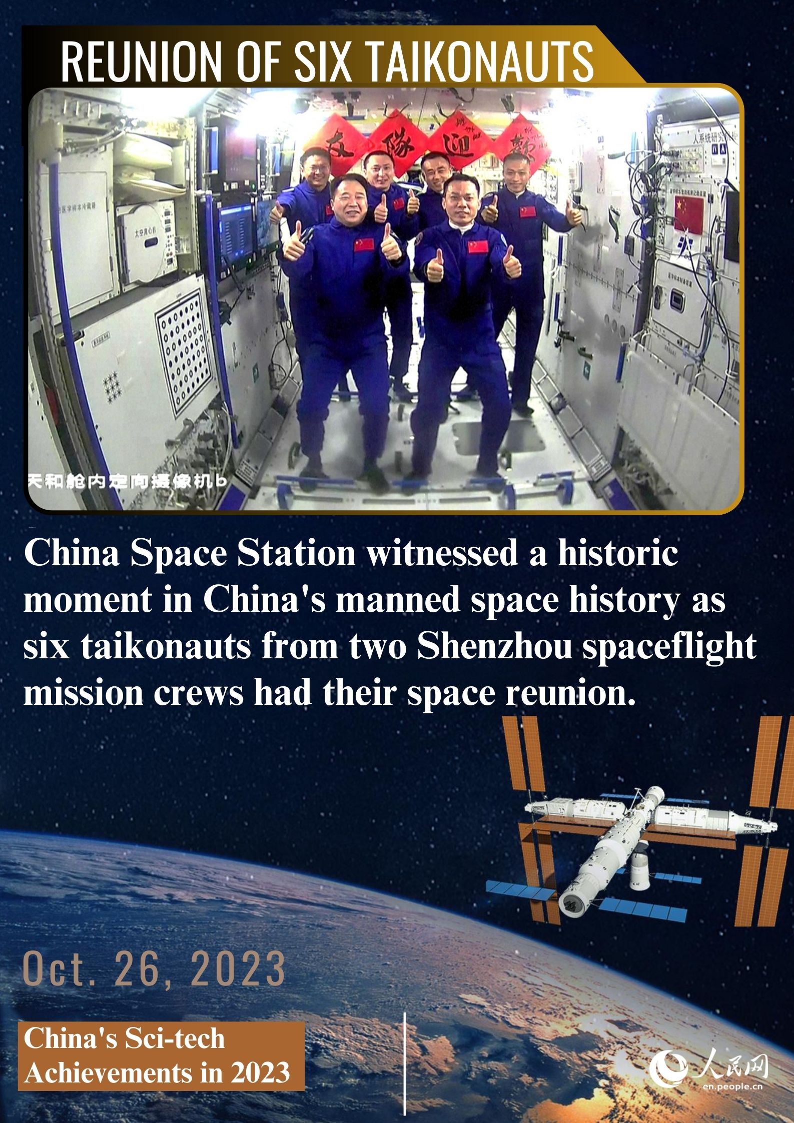 On the momentous occasion of the 20th anniversary of China's first manned spaceflight of the Shenzhou-5, China Space Station, also known as Tiangong, which means "heavenly palace", witnessed another historic moment in China's manned space history as six taikonauts from two Shenzhou spaceflight mission crews had their space reunion on October 26, 2023.