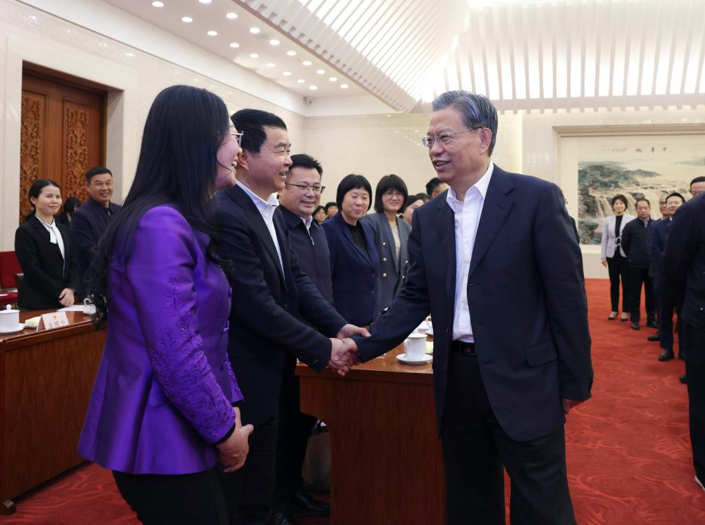 Zhao Leji, a member of the Standing Committee of the Political Bureau of the Communist Party of China Central Committee and chairman of the National People's Congress (NPC) Standing Committee, attends a symposium with NPC deputies sitting in on the seventh session of the 14th NPC Standing Committee in Beijing, capital of China, Dec. 27, 2023. (Xinhua/Liu Weibing)