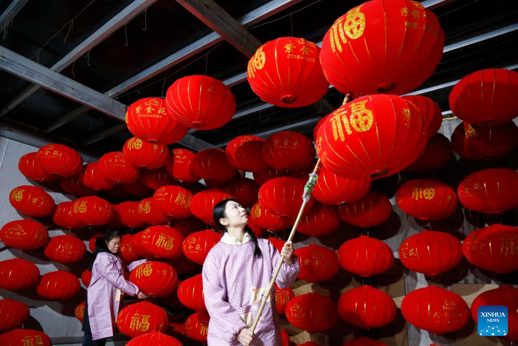 Workers dry lanterns at a workshop in Dongshanzhao Township of Xingtai City, north China's Hebei Province, Dec. 27, 2023. As the new year approaches, lantern workshops increased the capacity of production in Xingtai City of Hebei Province to meet the market demand. (Photo by Zhang Chi/Xinhua)