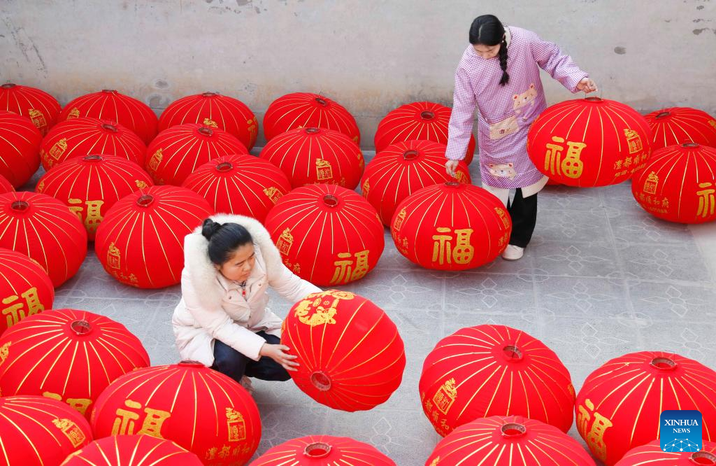 A worker checks a finished lantern at a workshop in Dongshanzhao Township of Xingtai City, north China's Hebei Province, Dec. 27, 2023. As the new year approaches, lantern workshops increased the capacity of production in Xingtai City of Hebei Province to meet the market demand. (Photo by Zhang Chi/Xinhua)