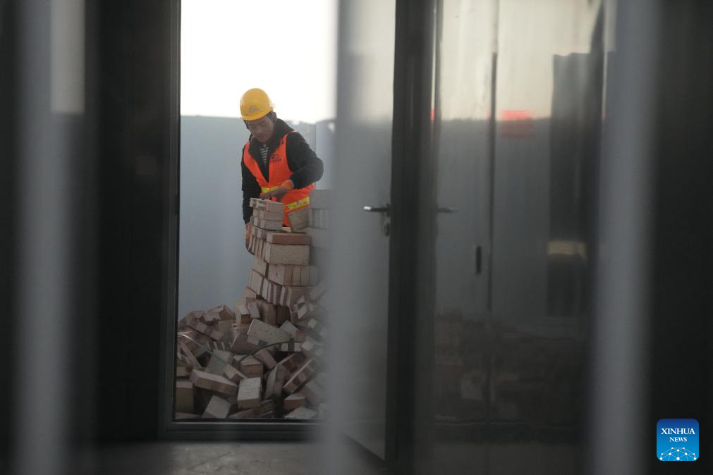 A construction worker checks the condition of prefab houses at a temporary settlement site in Chuimatan Town of Jishishan, northwest China's Gansu Province, Dec. 27, 2023. (Xinhua/Chen Bin)