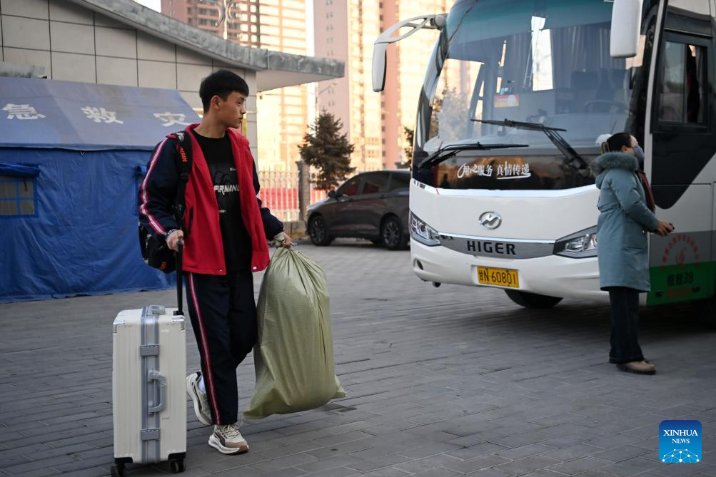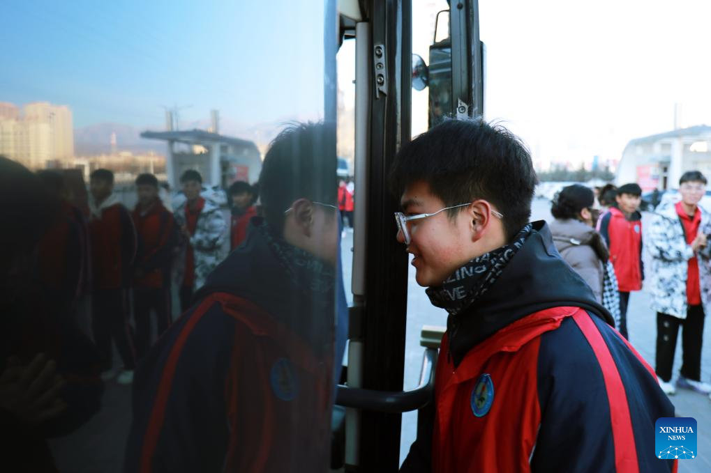 A grade three student boards a bus at the Jishi High School in Jishishan County, northwest China's Gansu Province, Dec. 28, 2023. (Xinhua/Zhang Rui)