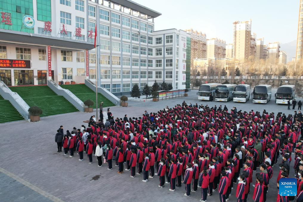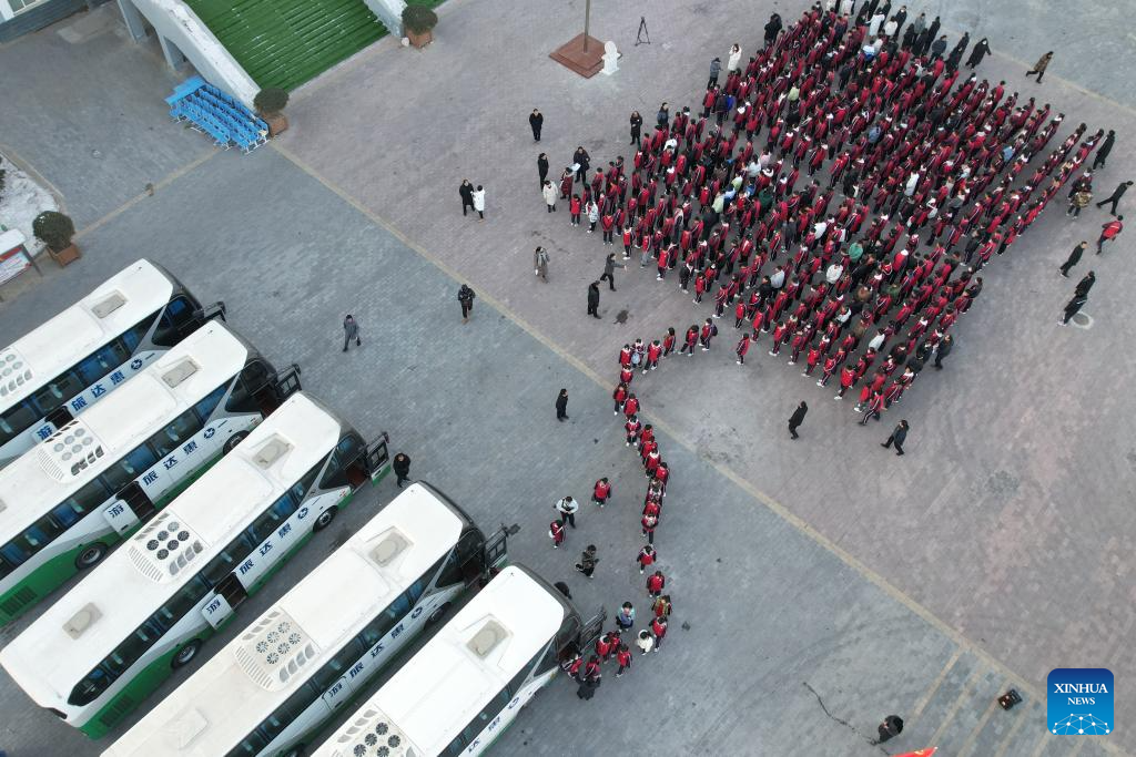 This aerial photo taken on Dec. 28, 2023 shows grade three students lining up to board buses at the Jishi High School in Jishishan County, northwest China's Gansu Province. (Xinhua/Fan Peishen)
