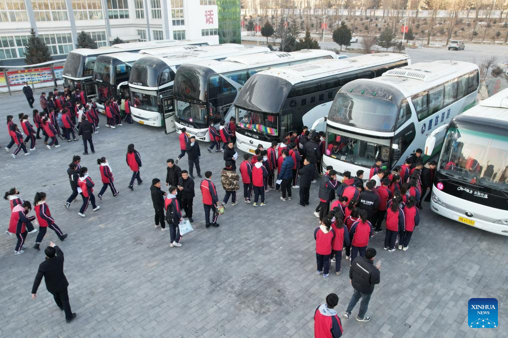 This aerial photo taken on Dec. 28, 2023 shows grade three students preparing to board buses at the Jishi High School in Jishishan County, northwest China's Gansu Province. (Xinhua/Fan Peishen)