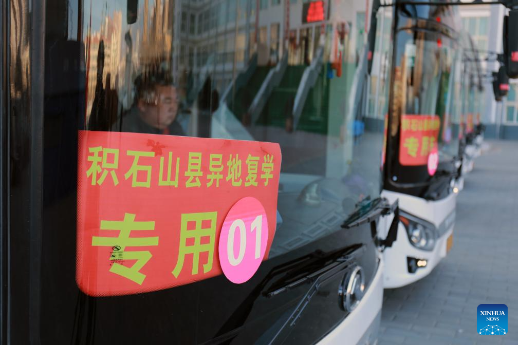 Hundreds of grade three students from Jishi High School were transported to Linxia Vocational and Technical School in Linxia Hui Autonomous Prefecture to resume class on Thursday. According to the arrangement of the education department, all the grade three high school students in Bonan-Dongxiang-Salar Autonomous County of Jishishan will resume class in other areas this week.