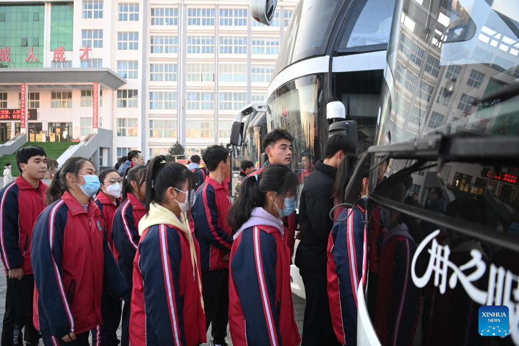 Grade three students line up to board a bus at the Jishi High School in Jishishan County, northwest China's Gansu Province, Dec. 28, 2023. (Xinhua/Fan Peishen)