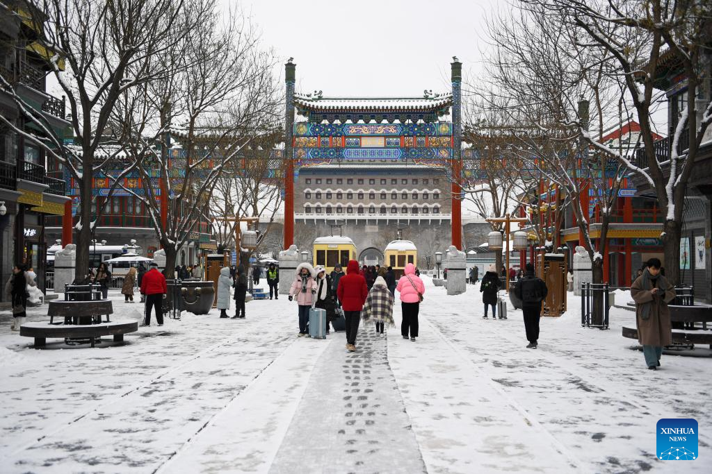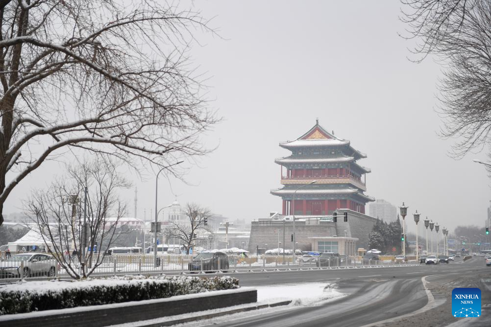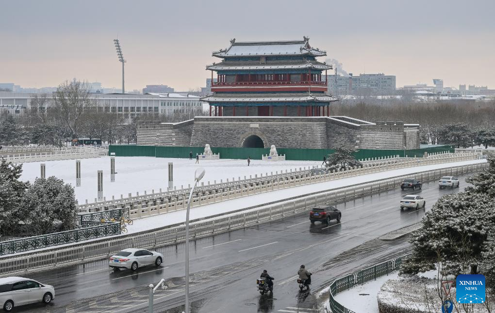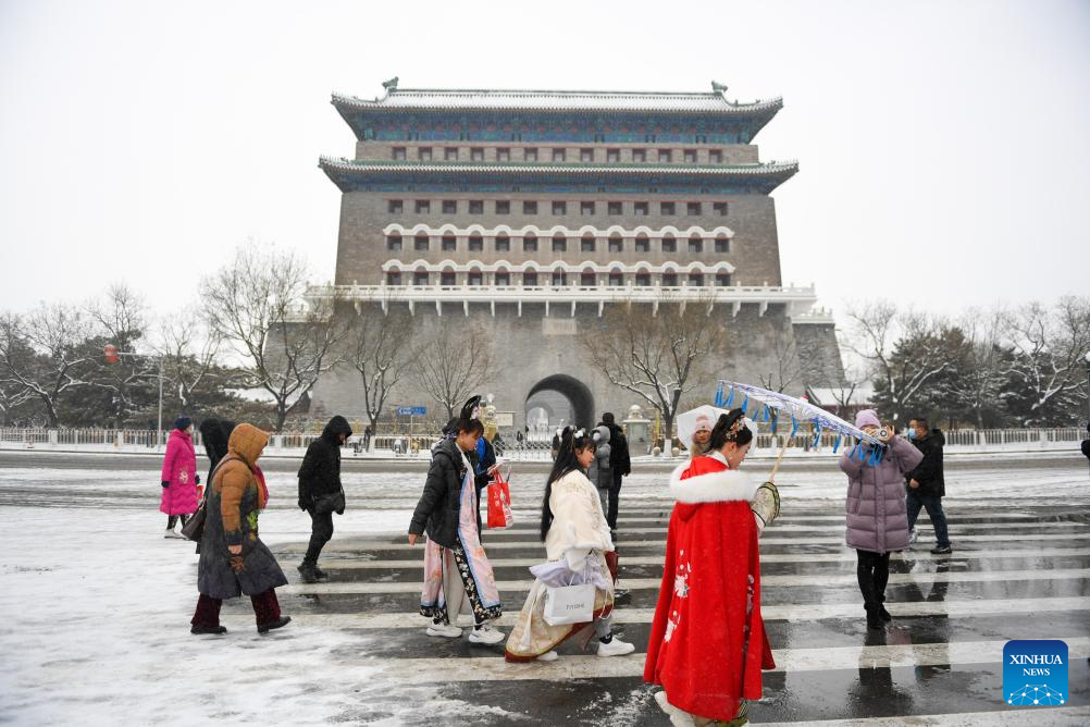 People visit the Qianmen Street in front of the Zhengyang Gate arrow tower in snowfall in Beijing, capital of China, Dec. 14, 2023. (Xinhua/Ju Huanzong)