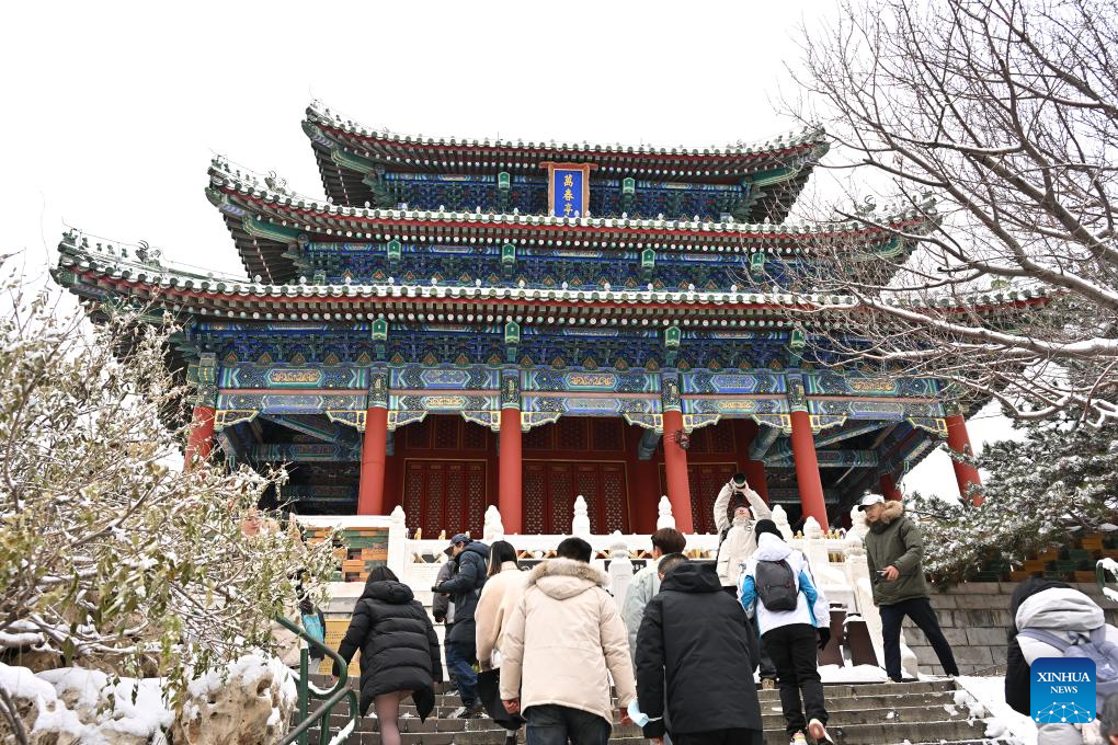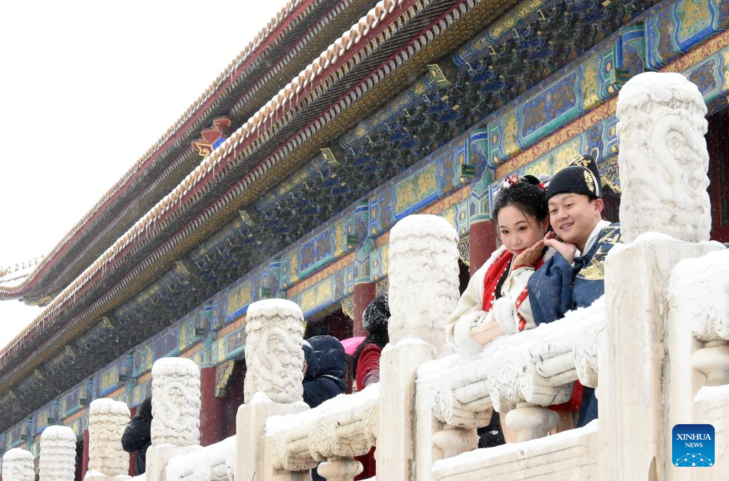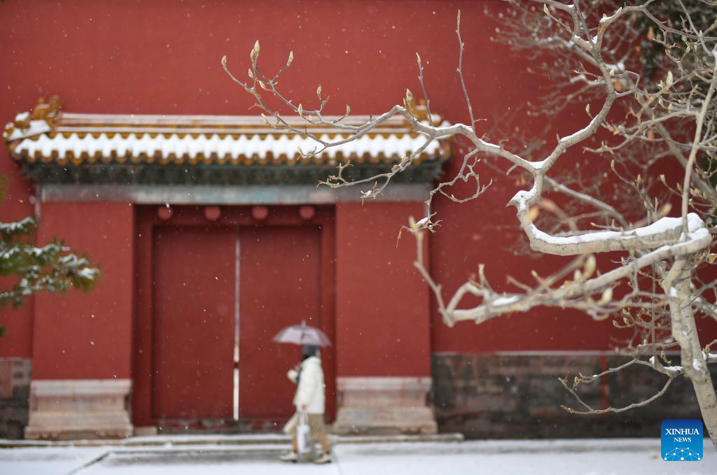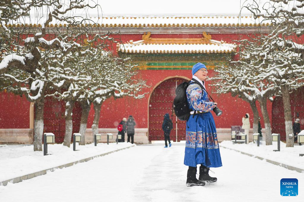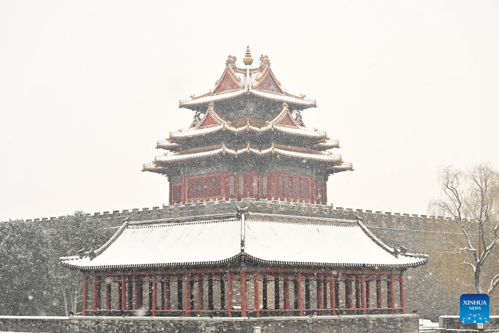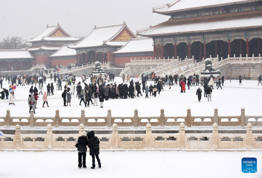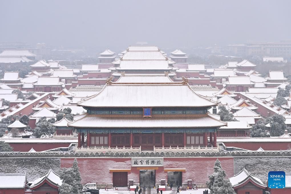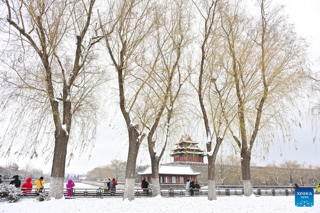 Visitors enjoy snow scenery at the Palace Museum in Beijing, capital of China, Dec. 14, 2023. (Xinhua/Luo Xiaoguang)