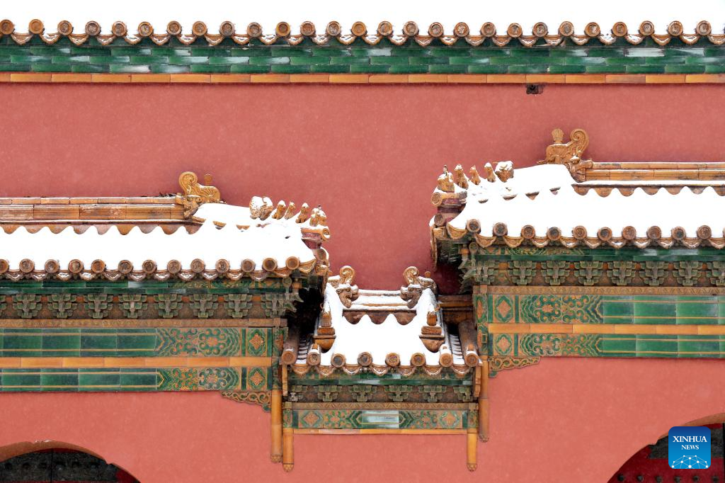 This photo taken on Dec. 14, 2023 shows a corner of the Palace Museum covered by snow in Beijing, capital of China. (Xinhua/Luo Xiaoguang)