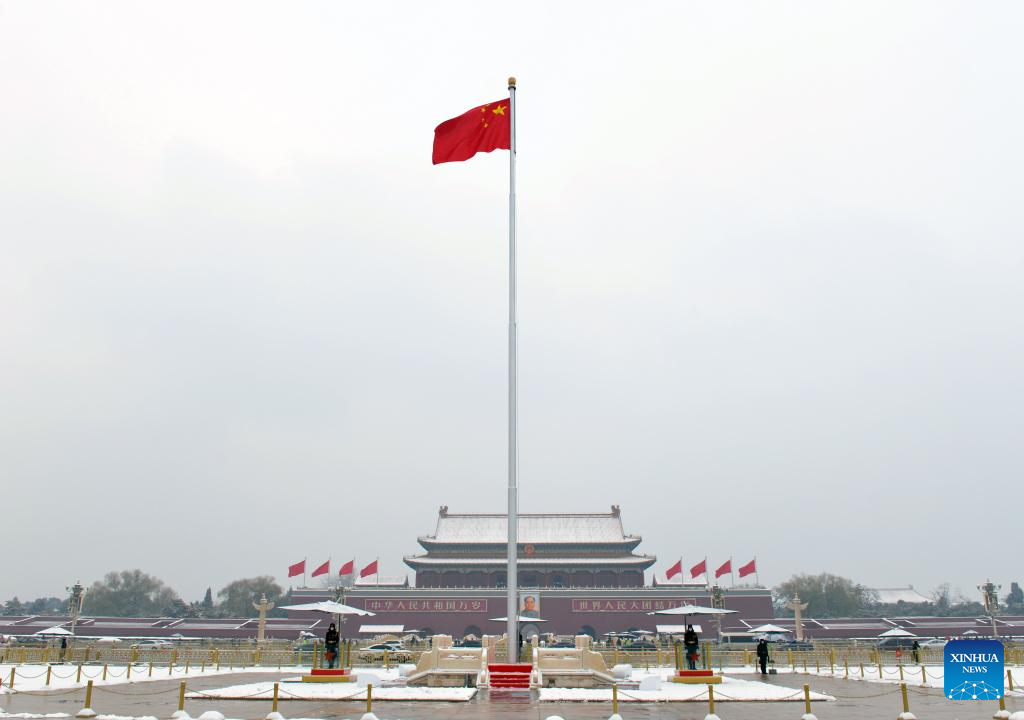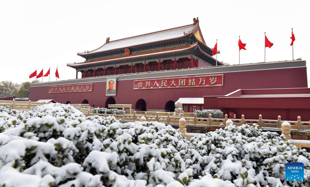 This photo taken on Dec. 11, 2023 shows the Tian'anmen Square in snowfall in Beijing, capital of China. (Xinhua/Ren Chao)