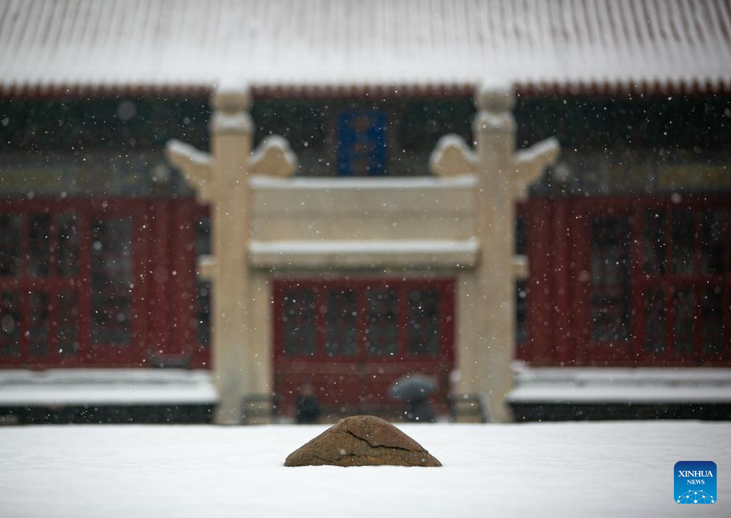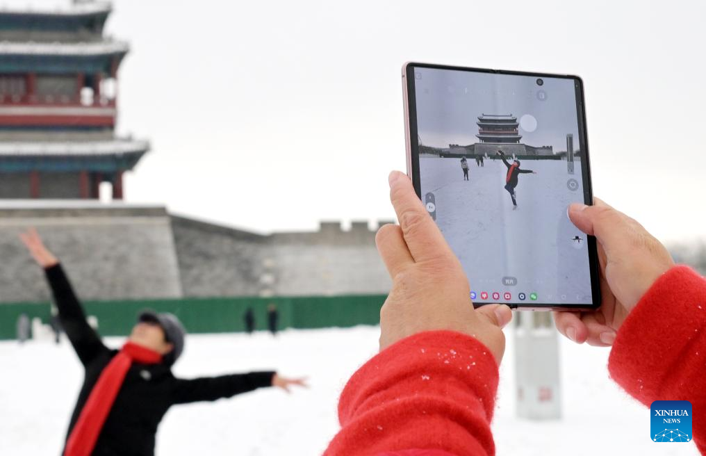 A visitor takes photos of snow scenery in front of the Imperial Ancestral Temple in Beijing, capital of China, Dec. 14, 2023. (Xinhua/Chen Zhonghao)
