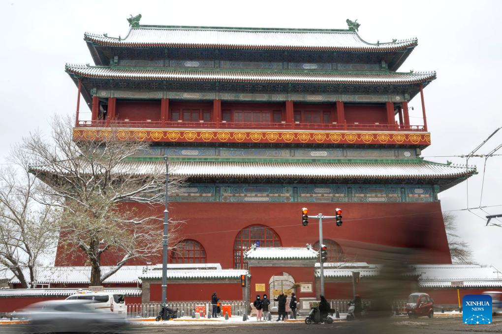 This photo taken on Dec. 11, 2023 shows the snow scenery of the Drum Tower in Beijing, capital of China. (Xinhua/Cai Yang)