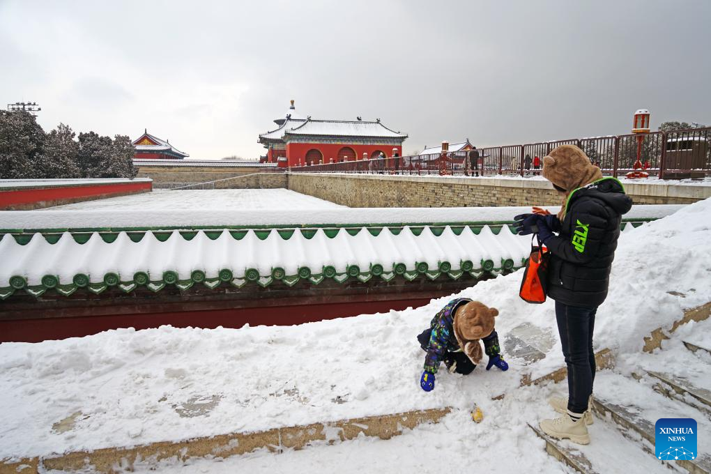 A mother and her child play with the snow at the Temple of Heaven in Beijing, capital of China, Dec. 11, 2023. (Xinhua/Mu Wenchun)