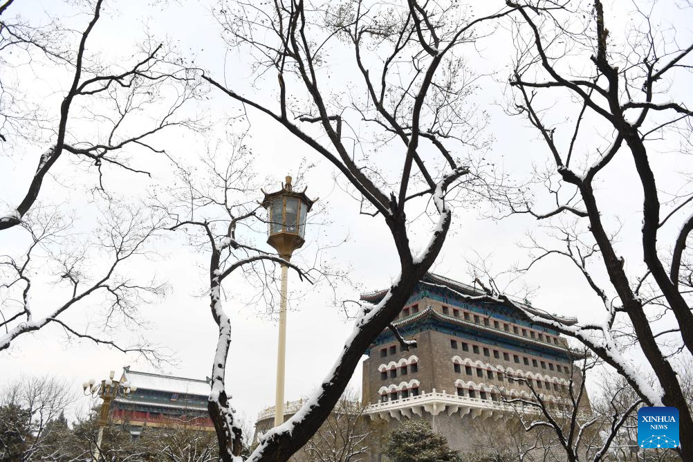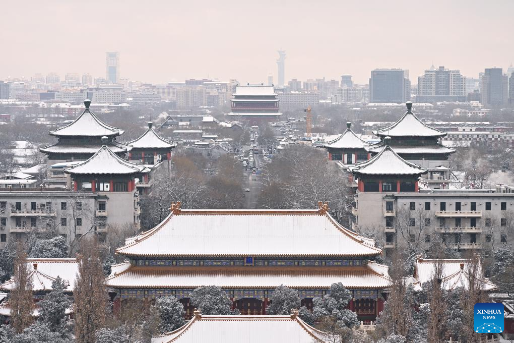 This photo taken on Dec. 11, 2023 shows the snow scenery of the Drum Tower seen from the Jingshan Mountain in Beijing, capital of China. (Xinhua/Li Xin)